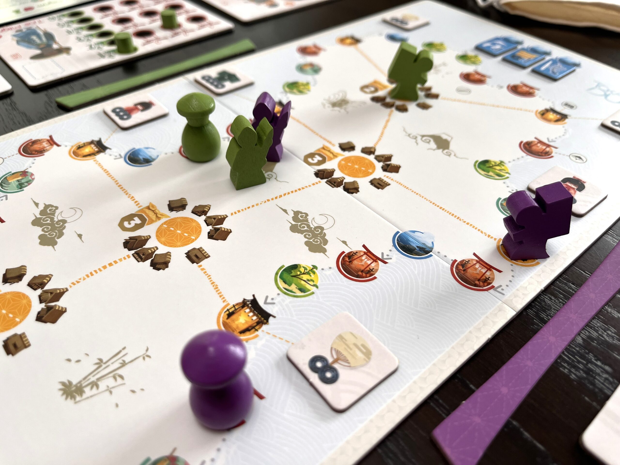 In Tokaido Duo, two players take turns travelling around the smallest of Japan’s four islands. You will experience this setting through three different characters, and go through a three-faceted spiritual journey.